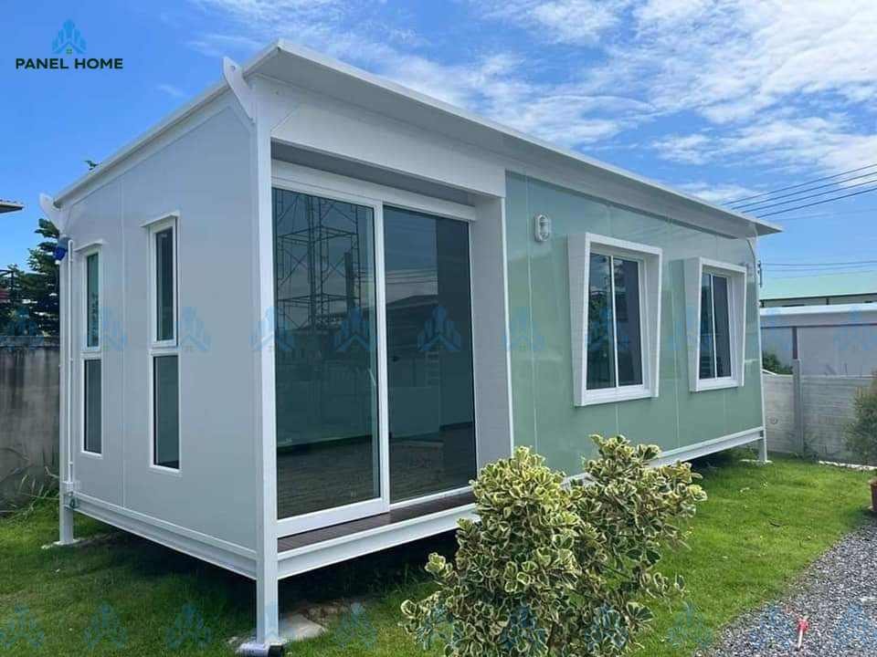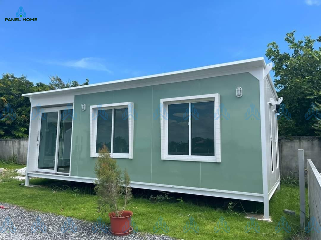 Với màu xanh ngọc từ tấm panel giúp căn nhà trở nên khác biệt và đẹp mắt. Không những thế, những tấm panel còn có tác dụng cách âm, cách nhiệt và chống cháy lan vô cùng tốt. Sử dụng hệ thống khung thép chịu lực nên ngôi nhà vô cùng chắc chắn, có thể chịu được gió bão lên tới cấp 12.