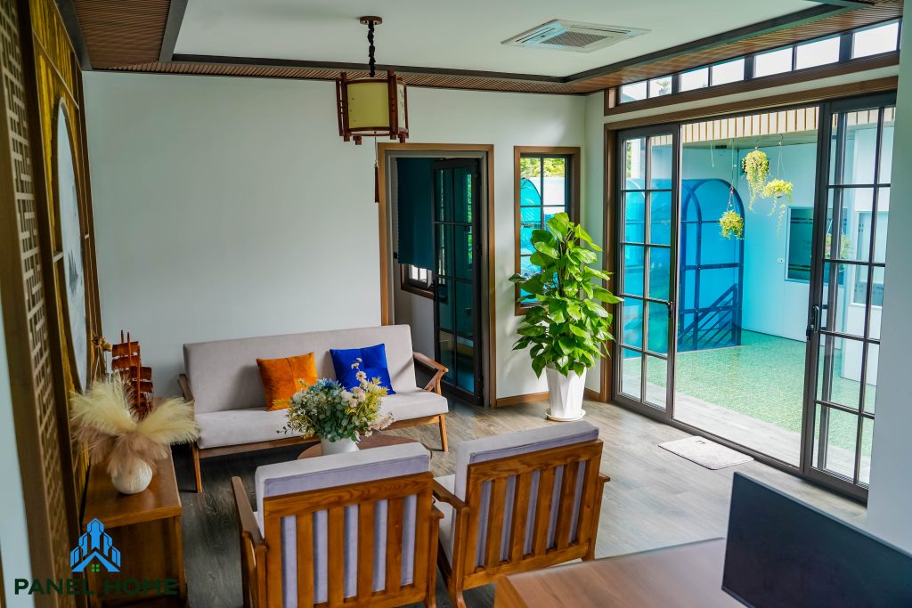 Không gian phòng họp rộng rãi, được thiết kế và sắp xếp nội thất theo yêu cầu của chủ đầu tư. Cửa nhôm kính xingfa luôn được ưu tiên sử dụng trong nhà lắp ghép của Panel Home. Bởi những ưu điểm tuyệt vời mà nó mang lại như tính thẩm mỹ và tính năng vượt trội như cách âm, cách nhiệt, dễ lau chùi.